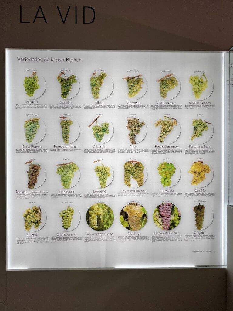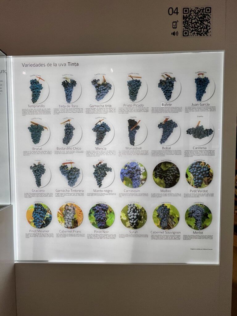 - Variedades de uva: un completo panel muestra las principales variedades tintas y blancas cultivadas en Castilla y León y otras regiones, desde la tempranillo, la tinta de toro o la garnacha, hasta la verdejo, godello o albillo.