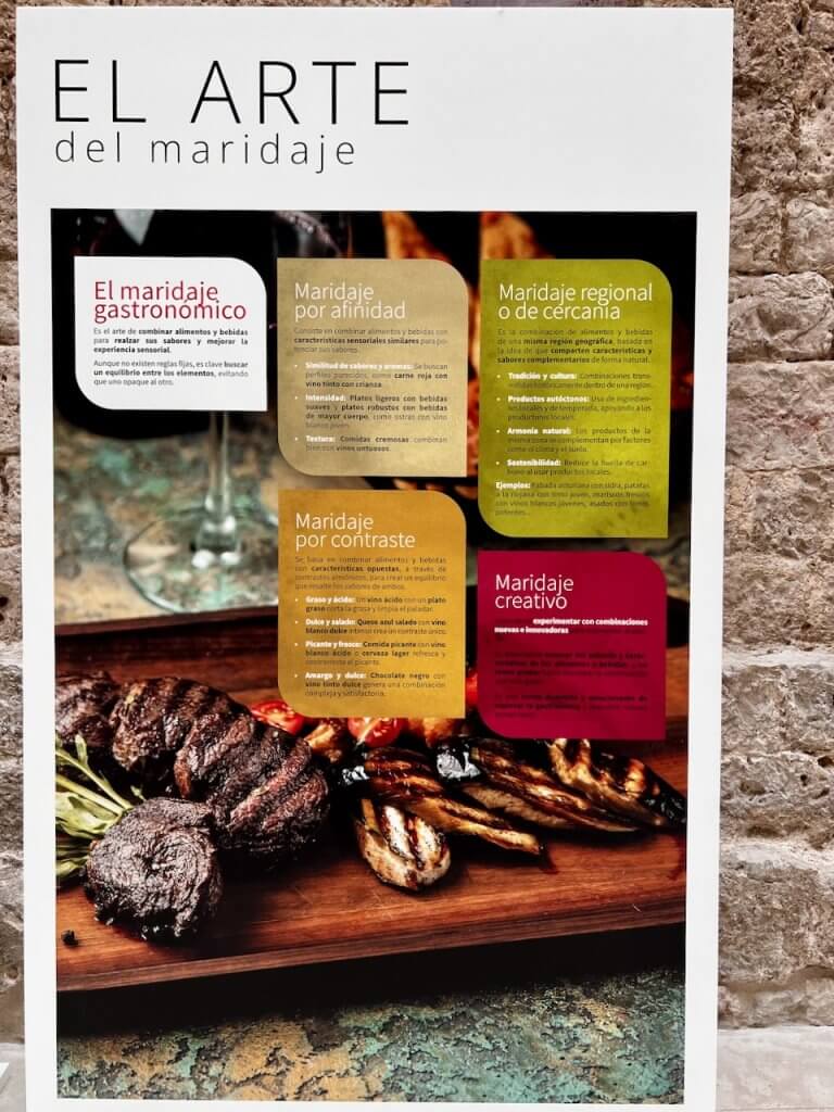 - El arte del maridaje: paneles dedicados a las combinaciones gastronómicas entre vino y alimentos, con ejemplos de maridaje por afinidad, contraste o cercanía.