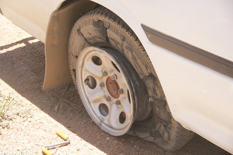 Cuatro pinchazos, tres de ellos el mismo día, nos convirtió en el vehículo «gafe» del convoy. El último de ellos cuando anochecía dentro de la Reserva Nacional Masai Mara.